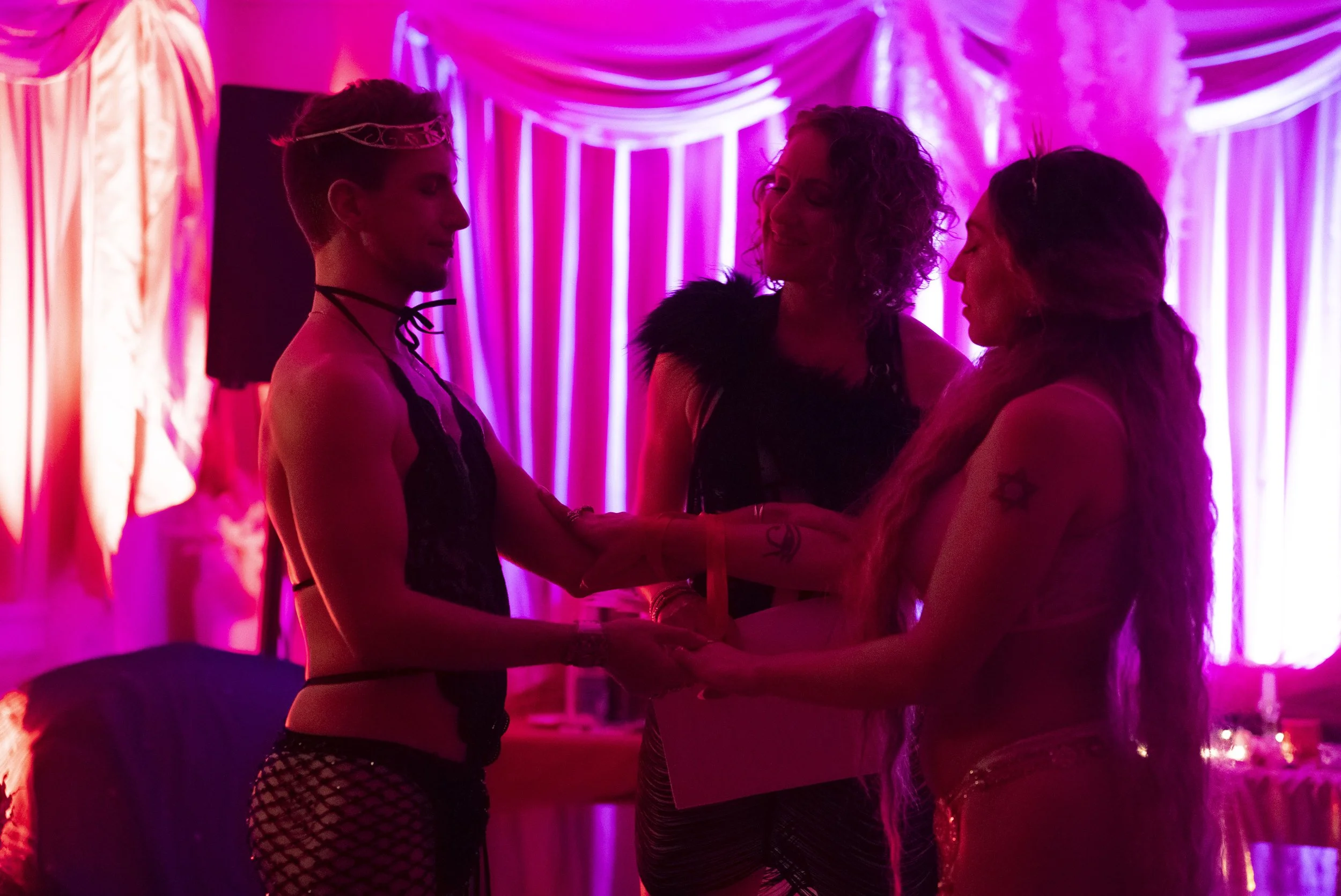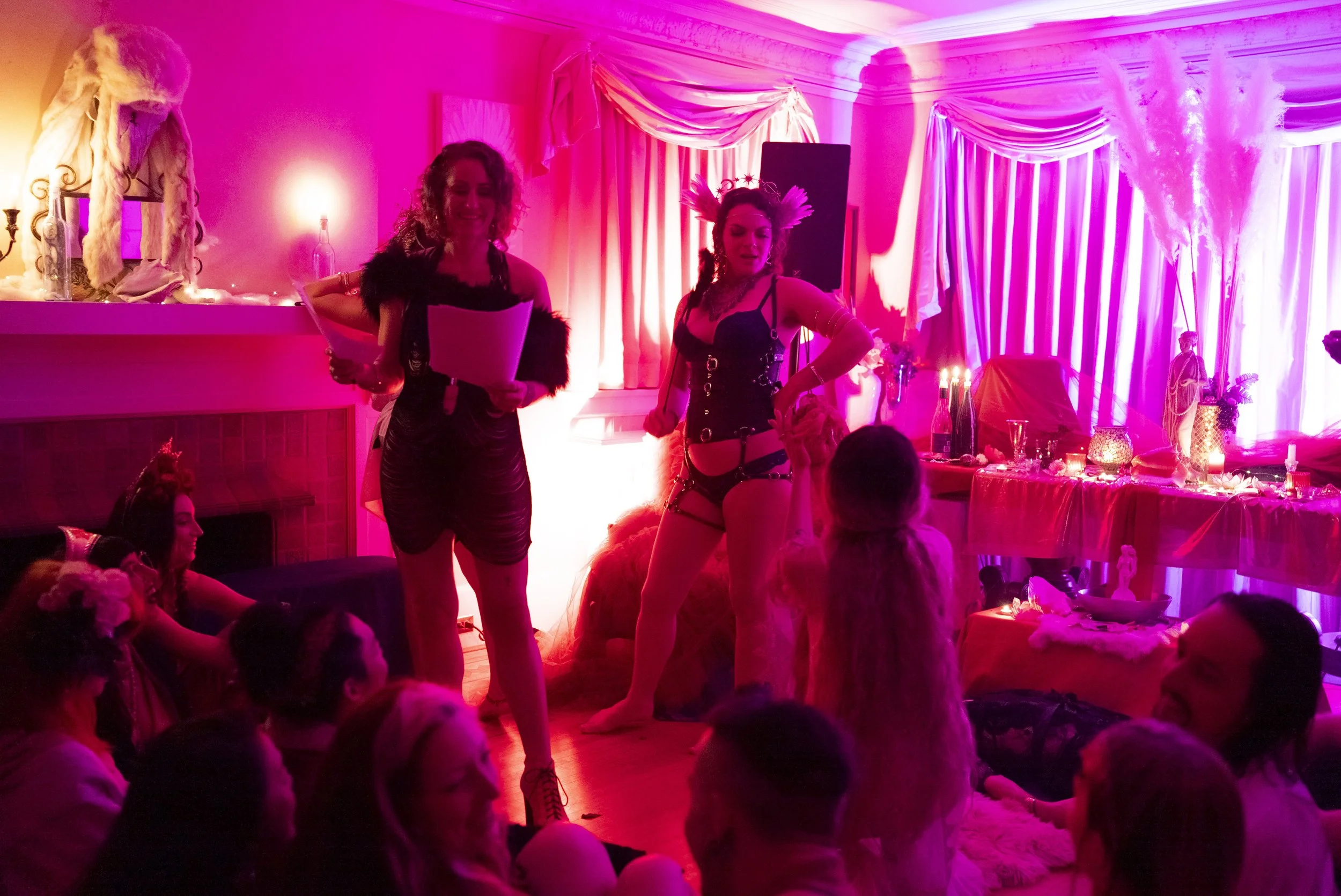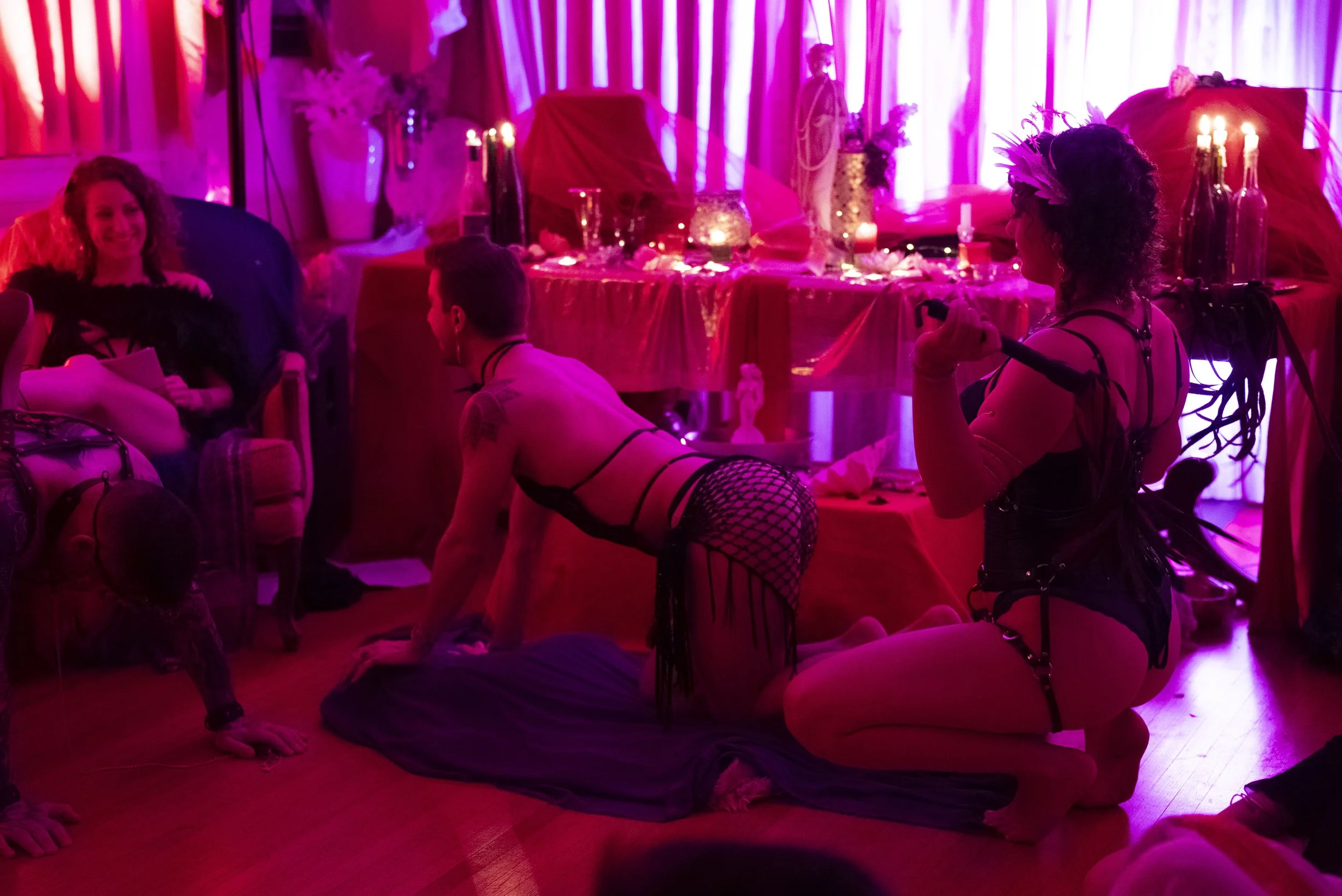 We consider this to be an erotic ritual theatre experience, where participants are encouraged to explore their erotic expression and sensuality. We’re here to play with sensuality and expression - evoke seduction, flirty playfulness, and creating an environment for your erotic siren, graceful goddess, or commanding heathen to come online.